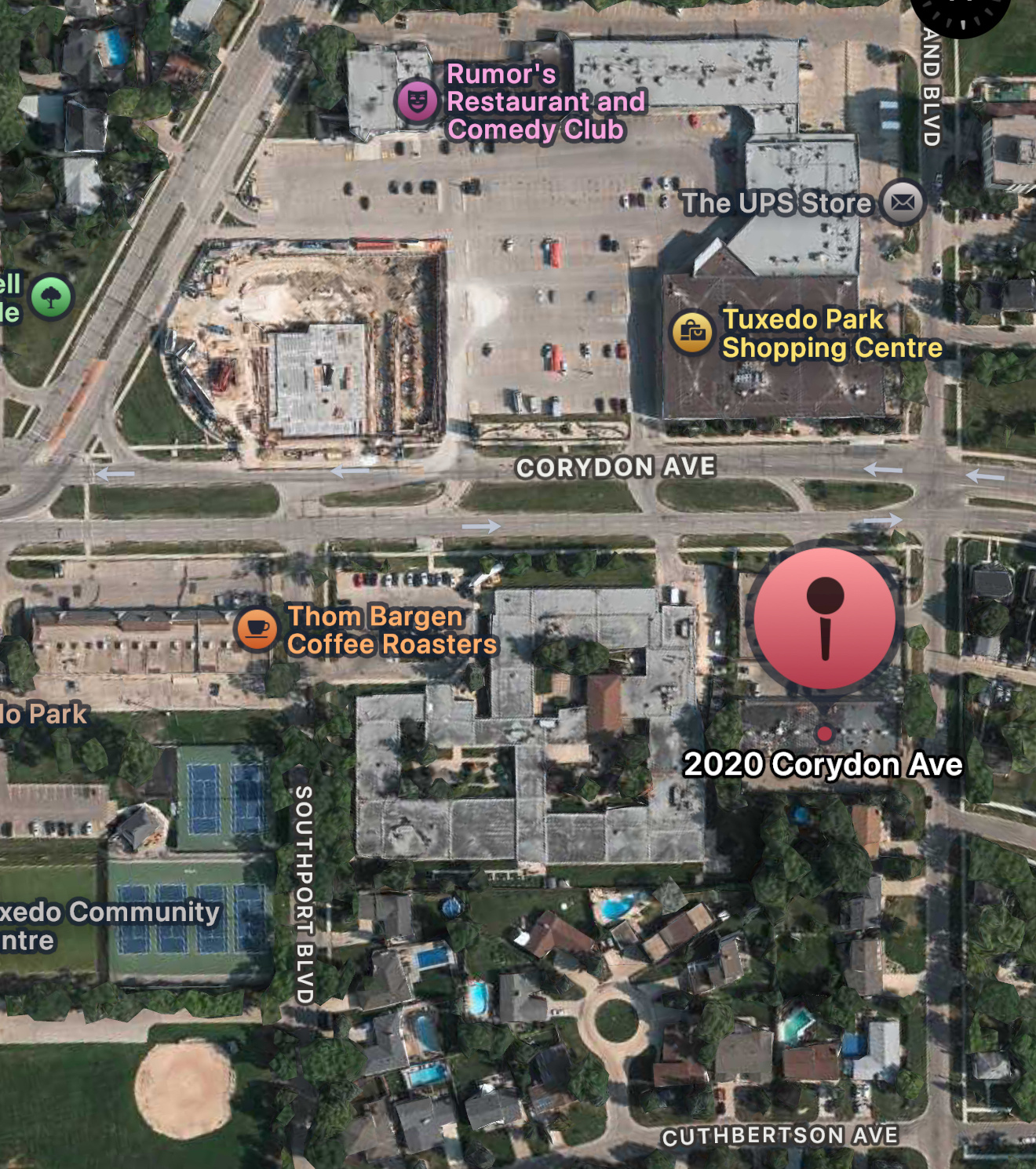 We are located just off of Corydon in the Tuxedo Edge Shopping Center across the street from the Tuxedo Park Shopping Centre (featuring Safeway, Shoppers, and Rumours). We are right beside the Almond Nail Bar.